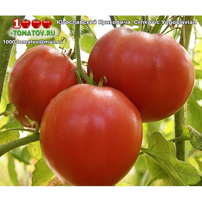 Томат Югославский Крнковича Crnkovic Yugoslavian (Югославия) фамильная реликвия семьи Crnkovic. Индет, среднеранний. Формируется в 1-2 стебля с обязательной подвязкой. Плоды красные с малиновым оттенком гиганты, которые при нормировке могут достигать до 1 кг. Мясистые, ароматные, вкусные. Очень урожайный сорт с вкуснейшими плодами.